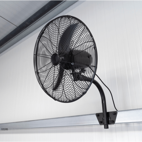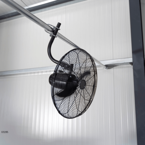 Modell 03.285 är idealisk för montering i lägre hallar eller där en mer horisontal luftström efterfrågas. Skyddsgallret förhindrar föremål från att skada fläktbladen vilket även gör den lämplig för installation i sporthallar etc. Väggfäste ingår i leveransen. Alternativt fäste för rör (2") samt säkerhetskätting kan beställas.